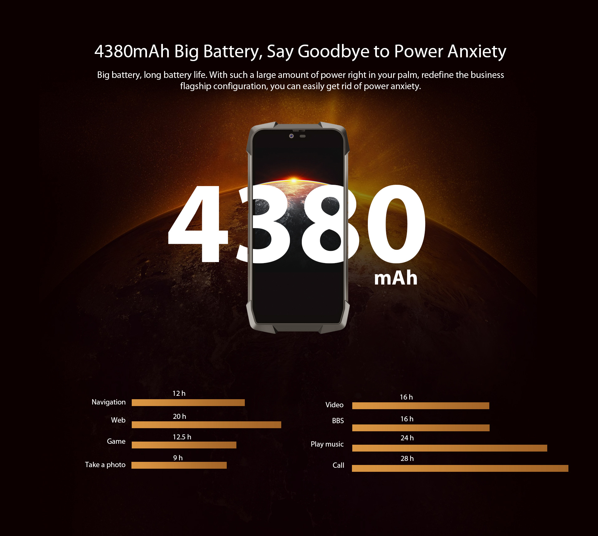 Мощный аккумулятор на 4380 мАч. Максимальная защита по стандарту IP69K. 6GB RAM + 128GB ROM, 64-битный 8-ядерный процессор MediaTek Helio P90. Экран 5.84" 19:9 IPS, Android 10